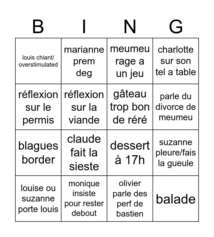 This bingo card has 16 words: monique insiste pour rester debout, suzanne pleure/fais la gueule, meumeu rage a un jeu, louis chiant/ overstimulated, blagues border, marianne prem deg, dessert à 17h, olivier parle des perf de bastien, réflexion sur le permis, réflexion sur la viande, louise ou suzanne porte louis, charlotte sur son tel a table, claude fait la sieste, parle du divorce de meumeu, gâteau trop bon de réré and balade.
