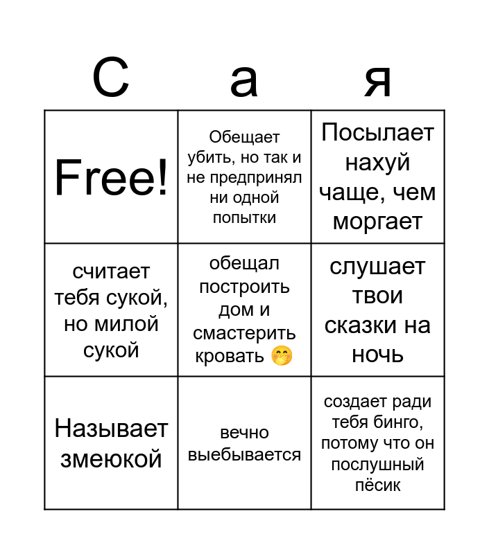 This bingo card has 9 words: Называет змеюкой, Посылает нахуй чаще, чем моргает, Обещает убить, но так и не предпринял ни одной попытки, считает тебя сукой, но милой сукой, Free!, слушает твои сказки на ночь, обещал построить дом и смастерить кровать 🤭, создает ради тебя бинго, потому что он послушный пёсик and вечно выебывается.
