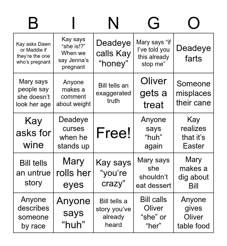 This bingo card has a free space and 24 words: Mary rolls her eyes, Anyone says “huh”, Bill tells an exaggerated truth, Anyone describes someone by race, Deadeye farts, Kay asks Dawn or Maddie if they’re the one who’s pregnant, Mary says people say she doesn’t look her age, Kay says “she is!?” When we say Jenna’s pregnant, Anyone says “huh” again, Kay says “you’re crazy”, Oliver gets a treat, Kay asks for wine, Mary says she shouldn’t eat dessert, Mary makes a dig about Bill, Anyone makes a comment about weight, Bill calls Oliver “she” or “her”, Kay realizes that it’s Easter, Deadeye calls Kay “honey”, Someone misplaces their cane, Deadeye curses when he stands up, Anyone gives Oliver table food, Bill tells an untrue story, Mary says “if I’ve told you this already stop me” and Bill tells a story you’ve already heard.