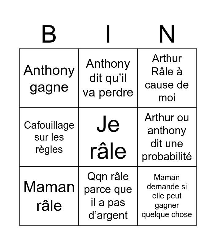 This bingo card has a free space and 8 words: Arthur ou anthony dit une probabilité, Arthur Râle à cause de moi, Anthony dit qu’il va perdre, Maman râle, Anthony gagne, Maman demande si elle peut gagner quelque chose, Cafouillage sur les règles and Qqn râle parce que il a pas d’argent.