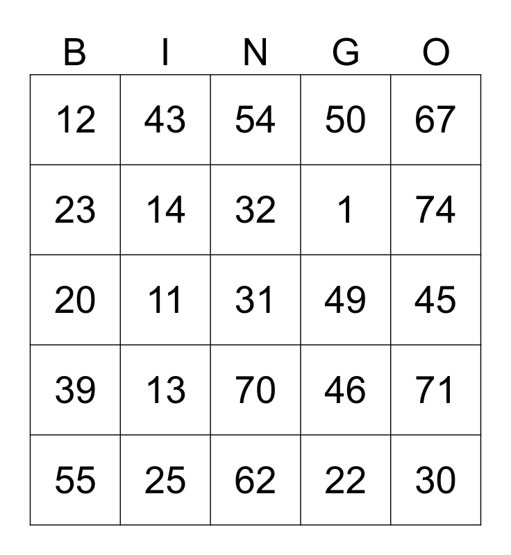 This bingo card has a free space and 24 words: 13, 25, 32, 55, 67, 12, 23, 43, 49, 70, 1, 20, 46, 71, 14, 22, 45, 54, 74, 11, 30, 39, 50 and 62.