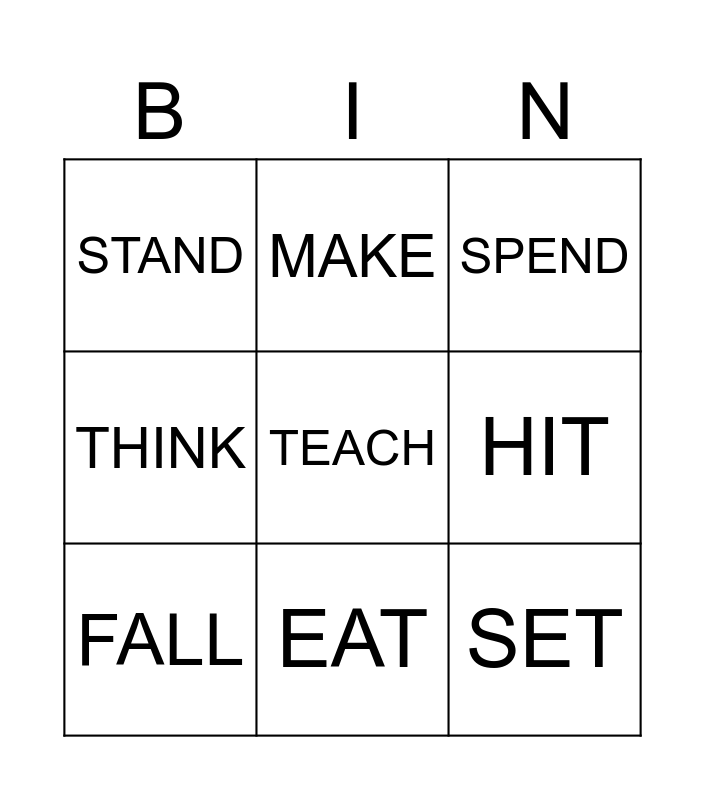 This bingo card has 69 words: WRITE, WIN, WEAR, WAKE, UNDERSTAND, THROW, THINK, TELL, TEACH, TAKE, SWIM, STEAL, STAND, SPEND, SPEAK, SLEEP, SING, SET, SEND, SELL, SEE, SAY, SIT, RUN, RING, RIDE, READ, PUT, PAY, MEAT, MAKE, LOSE, LET, LEND, LEAVE, KNOW, KEEP, HOLD, HIT, HEAR, HAVE, GROW, GO, GIVE, GET, FORGET, FLY, FIND, FEEL, FALL, EAT, DRIVE, DRINK, DRAW, DO, DEAL, CUT, COST, COME, CHOOSE, CATCH, BUY, BUILD, BRING, BREAK, BLOW, BEGIN, BECOME and BE.