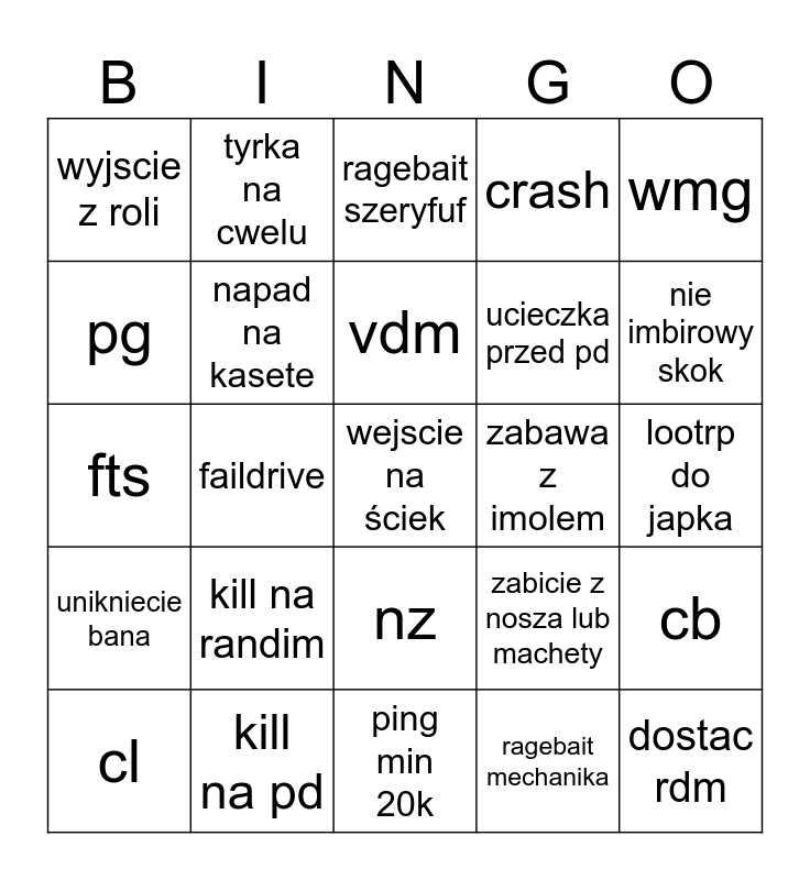 This bingo card has a free space and 24 words: kill na randim, kill na pd, vdm, cl, wmg, wyjscie z roli, pg, tyrka na cwelu, zabawa z imolem, nz, ucieczka przed pd, fts, zabicie z nosza lub machety, cb, napad na kasete, ragebait mechanika, lootrp do japka, ragebait szeryfuf, nie imbirowy skok, faildrive, dostac rdm, unikniecie bana, crash and ping min 20k.
