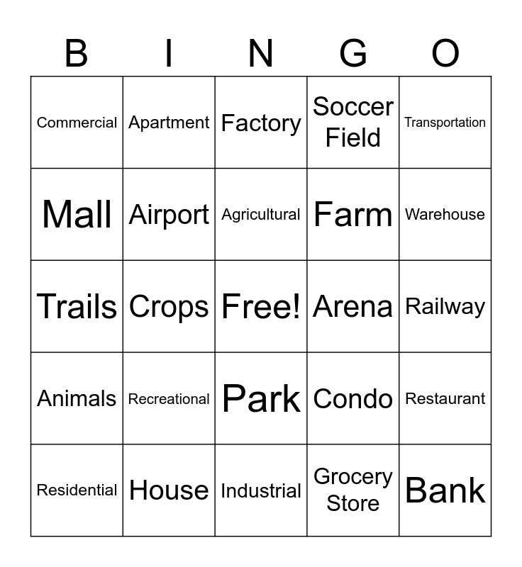 This bingo card has a free space and 25 words: Recreational, Industrial, Agricultural, Residential, Transportation, Commercial, Mall, Apartment, Arena, Park, Farm, Trails, Condo, Restaurant, Airport, Road, Railway, Factory, Warehouse, Crops, Bank, House, Animals, Soccer Field and Grocery Store.