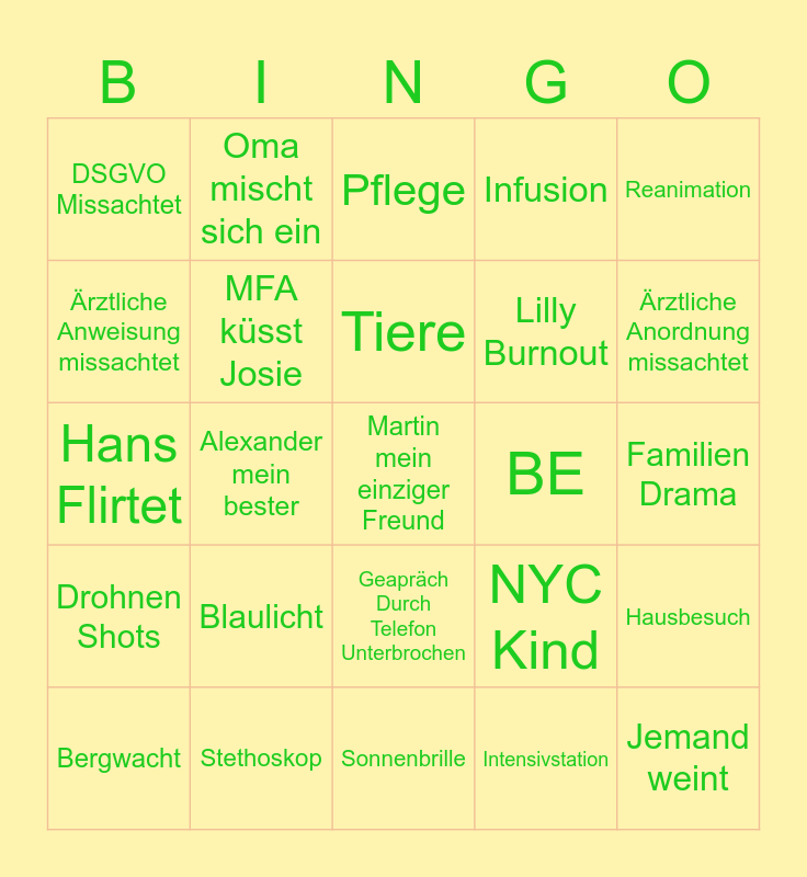 This bingo card has a free space and 24 words: Blaulicht, Stethoskop, Tiere, Bergwacht, Reanimation, DSGVO Missachtet, Ärztliche Anweisung missachtet, Oma mischt sich ein, BE, Geapräch Durch Telefon Unterbrochen, Lilly Burnout, Hans Flirtet, NYC Kind, Hausbesuch, MFA küsst Josie, Intensivstation, Familien Drama, Pflege, Ärztliche Anordnung missachtet, Alexander mein bester, Jemand weint, Drohnen Shots, Infusion and Sonnenbrille.
