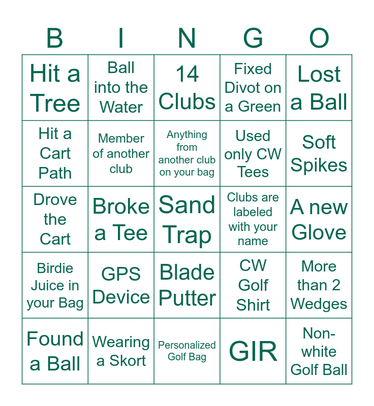 This bingo card has a free space and 24 words: GPS Device, Wearing a Skort, Anything from another club on your bag, Found a Ball, Lost a Ball, Hit a Tree, Hit a Cart Path, Ball into the Water, Clubs are labeled with your name, Blade Putter, Used only CW Tees, Drove the Cart, CW Golf Shirt, More than 2 Wedges, Member of another club, GIR, A new Glove, 14 Clubs, Soft Spikes, Broke a Tee, Non-white Golf Ball, Birdie Juice in your Bag, Fixed Divot on a Green and Personalized Golf Bag.