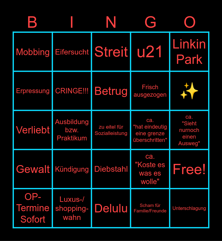 This bingo card has 49 words: Plötzlich Psychiater/ Therapie, zu eitel für Sozialleistung, Flucht, Delulu, Kündigung, Blumenladen bzw Baumarkt (garten), Eifersucht, Geschwister mobbing, Erpressung, (ca.) "Mir egal, wie du an das Geld kommst", CRINGE!!!, u21, Free!, ca. "Koste es was es wolle", Eltern ausnehmen, von "Zuhause" Abhauen, Betrug, ca. "hat eindeutig eine grenze überschritten", Schulden, Linkin Park, Ausbildung bzw. Praktikum, Scham für Familie/Freunde, Mobbing, Frisch ausgezogen, Falsche Freunde, ✨, OP-Termine Sofort, Aussehen Ändern, Diebstahl, Gewalt, Vermieter droht, BFF Ditch - ReUnite, ohne zu zahlen abhauen, Tut auf wohlhabend, Luxus-/ shopping- wahn, Gerichts- Vollzieher, unrealistische Strafe, Unterschrift Fälschen, ca. "Sieht nurnoch einen Ausweg", ca. "Qualität hat ihren Preis", Finanziell-abhängig, Tür einfach öffnen, Unterschlagung, ca. "muss auch schon wieder weg, Verliebt, Streit, Alles für Hyperfixation, Kosmetiker bzw Kosmetikstudio and ca. "selber schuld".