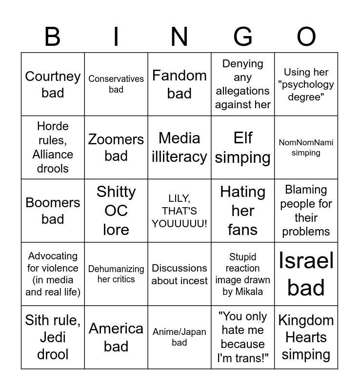 This bingo card has a free space and 24 words: Dehumanizing her critics, America bad, Media illiteracy, Sith rule, Jedi drool, Using her "psychology degree", Courtney bad, Horde rules, Alliance drools, Conservatives bad, Hating her fans, Discussions about incest, Elf simping, Boomers bad, Stupid reaction image drawn by Mikala, Israel bad, Zoomers bad, "You only hate me because I'm trans!", Blaming people for their problems, Fandom bad, NomNomNami simping, Shitty OC lore, Kingdom Hearts simping, Advocating for violence (in media and real life), Denying any allegations against her and Anime/Japan bad.