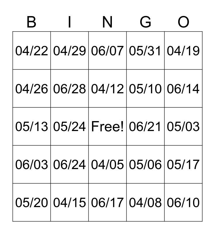 This bingo card has a free space and 26 words: 04/05, 04/08, 04/12, 04/15, 04/19, 04/22, 04/26, 04/29, 05/03, 05/06, 05/10, 05/13, 05/17, 05/20, 05/24, 05/27, 05/31, 06/03, 06/07, 06/10, 06/14, 06/17, 06/21, 06/24, 06/28 and 07/01.