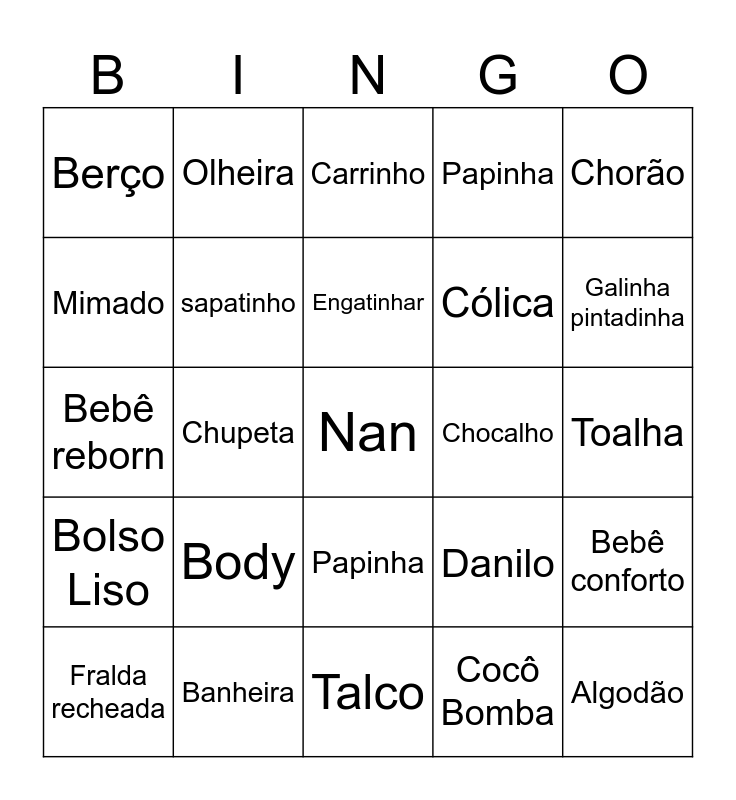 This bingo card has a free space and 29 words: Fralda recheada, Mamadeira, Chupeta, Babador, Berço, Carrinho, sapatinho, Body, Chocalho, Banheira, Toalha, Algodão, Talco, Cocô Bomba, Galinha pintadinha, Insônia, Papinha, Bolso Liso, Chorão, Bebê reborn, Danilo, Bafo de leite, Cólica, Mimado, Papinha, Olheira, Bebê conforto, Engatinhar and Tetê.