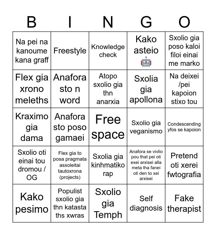 This bingo card has a free space and 24 words: Flex gia to posa pragmata asxoleitai tautoxrona (projects), Populist sxolio gia thn katasta ths xwras, Atopo sxolio gia thn anarxia, Kako pesimo, Sxolio gia poso kaloi filoi einai me marko, Na pei na kanoume kana graff, Flex gia xrono meleths, Freestyle, Sxolio gia veganismo, Sxolia gia kinhmatiko rap, Sxolia gia apollona, Kraximo gia dama, Anafora se vivlio pou that pei oti exei arxisei alla meta tha fanei oti den to xei arxisei, Pretend oti xerei fwtografia, Anafora sto n word, Self diagnosis, Condescending yfos se kapoion, Knowledge check, Na deixei /pei kapoion stixo tou, Anafora sto poso gamaei, Fake therapist, Sxolio oti einai tou dromou / OG, Kako asteio 🤖 and Sxolio gia Temph.