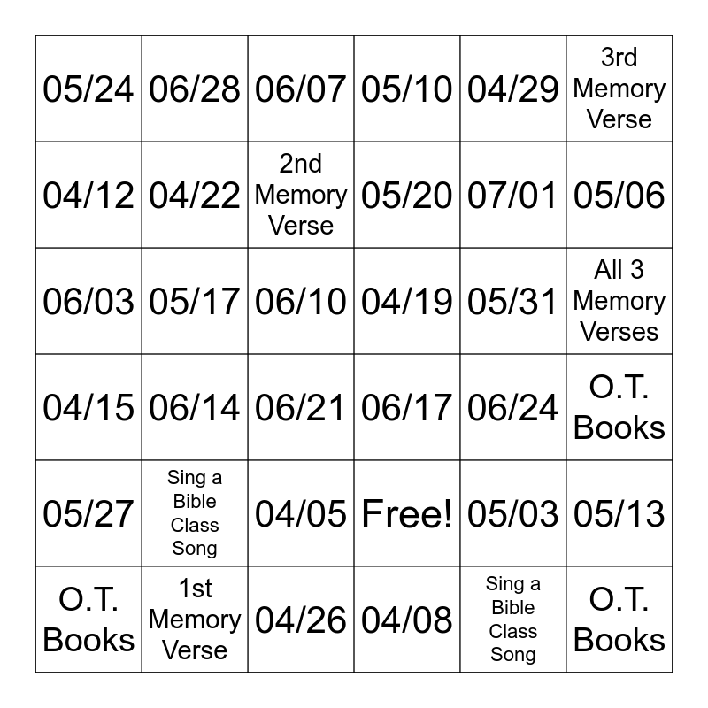 This bingo card has 36 words: Free!, 04/05, 04/08, 04/12, 04/15, 04/19, 04/22, 04/26, 04/29, 05/03, 05/06, 05/10, 05/13, 05/17, 05/20, 05/24, 05/27, 05/31, 06/03, 06/07, 06/10, 06/14, 06/17, 06/21, 06/24, 06/28, 07/01, 1st Memory Verse, 2nd Memory Verse, 3rd Memory Verse, O.T. Books, O.T. Books, O.T. Books, All 3 Memory Verses, Sing a Bible Class Song and Sing a Bible Class Song.