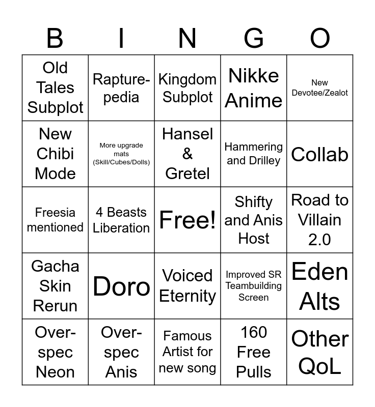This bingo card has a free space and 24 words: Doro, Over-spec Anis, Hansel & Gretel, Over-spec Neon, New Devotee/Zealot, Old Tales Subplot, New Chibi Mode, Rapture-pedia, Shifty and Anis Host, Voiced Eternity, Hammering and Drilley, Freesia mentioned, Improved SR Teambuilding Screen, Eden Alts, More upgrade mats (Skill/Cubes/Dolls), 160 Free Pulls, Road to Villain 2.0, Kingdom Subplot, Collab, 4 Beasts Liberation, Other QoL, Gacha Skin Rerun, Nikke Anime and Famous Artist for new song.