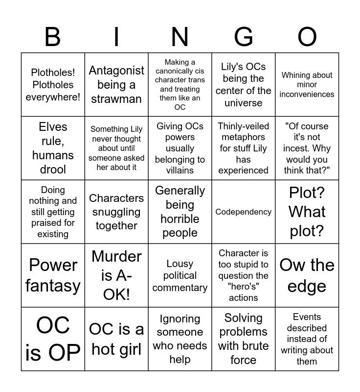 This bingo card has a free space and 24 words: Murder is A-OK!, OC is a hot girl, Giving OCs powers usually belonging to villains, OC is OP, Whining about minor inconveniences, Plotholes! Plotholes everywhere!, Elves rule, humans drool, Antagonist being a strawman, Codependency, Lousy political commentary, Thinly-veiled metaphors for stuff Lily has experienced, Doing nothing and still getting praised for existing, Character is too stupid to question the "hero's" actions, Ow the edge, Something Lily never thought about until someone asked her about it, Solving problems with brute force, Plot? What plot?, Making a canonically cis character trans and treating them like an OC, "Of course it's not incest. Why would you think that?", Characters snuggling together, Events described instead of writing about them, Power fantasy, Lily's OCs being the center of the universe and Ignoring someone who needs help.