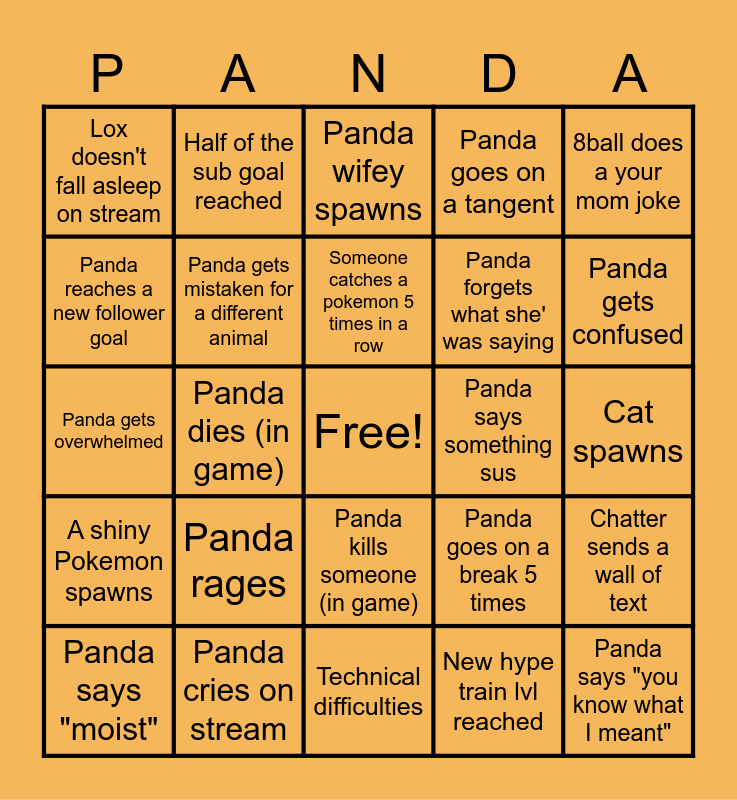 This bingo card has a free space and 24 words: Panda rages, Panda cries on stream, Someone catches a pokemon 5 times in a row, Panda says "moist", 8ball does a your mom joke, Lox doesn't fall asleep on stream, Panda reaches a new follower goal, Half of the sub goal reached, Panda says something sus, Panda kills someone (in game), Panda forgets what she' was saying, Panda gets overwhelmed, Panda goes on a break 5 times, Chatter sends a wall of text, Panda gets mistaken for a different animal, New hype train lvl reached, Cat spawns, Panda wifey spawns, Panda gets confused, Panda dies (in game), Panda says "you know what I meant", A shiny Pokemon spawns, Panda goes on a tangent and Technical difficulties.