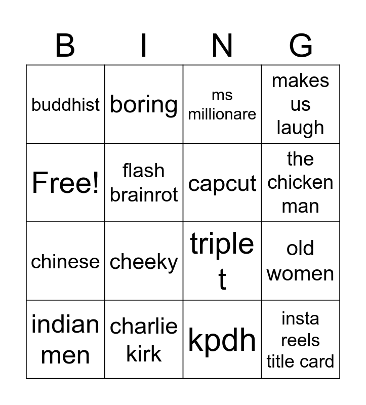 This bingo card has 16 words: charlie kirk, old women, ms millionare, buddhist, chinese, boring, triple t, kpdh, Free!, flash brainrot, indian men, makes us laugh, cheeky, the chicken man, capcut and insta reels title card.