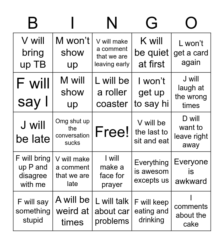 This bingo card has a free space and 24 words: V will make a comment that we are late, A will be weird at times, L will be a roller coaster, F will say something stupid, L won’t get a card again, V will bring up TB, F will say l, M won’t show up, V will be the last to sit and eat, I will make a face for prayer, I won’t get up to say hi, J will be late, Everything is awesom excepts us, Everyone is awkward, M will show up, F will keep eating and drinking, D will want to leave right away, V will make a comment that we are leaving early, J will laugh at the wrong times, Omg shut up the conversation sucks, I comments about the cake, F will bring up P and disagree with me, K will be quiet at first and L will talk about car problems.
