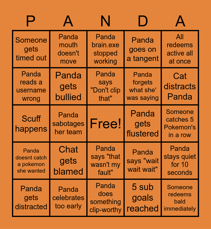 This bingo card has a free space and 24 words: Chat gets blamed, Panda celebrates too early, Panda says "Don't clip that", Panda gets distracted, All redeems active all at once, Someone gets timed out, Panda reads a username wrong, Panda mouth doesn't move, Panda gets flustered, Panda says "that wasn't my fault", Panda forgets what she' was saying, Scuff happens, Panda says "wait wait wait", Panda stays quiet for 10 seconds, Panda gets bullied, 5 sub goals reached, Someone catches 5 Pokemon's in a row, Panda brain.exe stopped working, Cat distracts Panda, Panda sabotages her team, Someone redeems bald immediately, Panda doesnt catch a pokemon she wanted, Panda goes on a tangent and Panda does something clip-worthy.