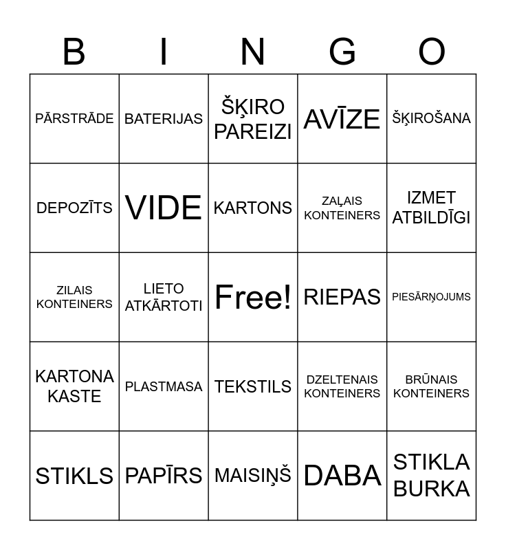This bingo card has a free space and 24 words: PLASTMASA, PAPĪRS, KARTONS, STIKLS, ŠĶIROŠANA, PĀRSTRĀDE, DEPOZĪTS, BATERIJAS, RIEPAS, TEKSTILS, ZAĻAIS KONTEINERS, ZILAIS KONTEINERS, DZELTENAIS KONTEINERS, BRŪNAIS KONTEINERS, VIDE, DABA, PIESĀRŅOJUMS, ŠĶIRO PAREIZI, IZMET ATBILDĪGI, LIETO ATKĀRTOTI, STIKLA BURKA, KARTONA KASTE, AVĪZE and MAISIŅŠ.
