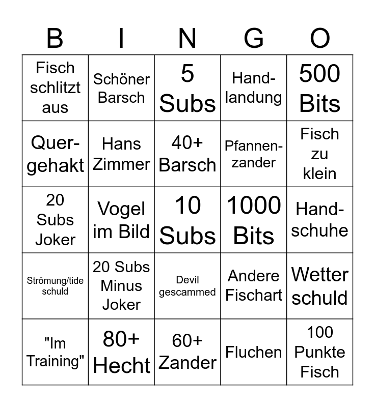 This bingo card has a free space and 24 words: 20 Subs Minus Joker, 80+ Hecht, 40+ Barsch, "Im Training", 500 Bits, Fisch schlitzt aus, Quer-gehakt, Schöner Barsch, 1000 Bits, Devil gescammed, Pfannen-zander, 20 Subs Joker, Andere Fischart, Wetter schuld, Hans Zimmer, Fluchen, Hand-schuhe, 5 Subs, Fisch zu klein, Vogel im Bild, 100 Punkte Fisch, Strömung/tide schuld, Hand-landung and 60+ Zander.