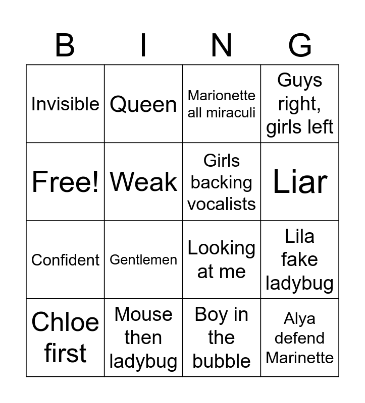 This bingo card has 16 words: Mouse then ladybug, Lila fake ladybug, Marionette all miraculi, Invisible, Confident, Queen, Looking at me, Boy in the bubble, Free!, Weak, Chloe first, Guys right, girls left, Gentlemen, Liar, Girls backing vocalists and Alya defend Marinette.