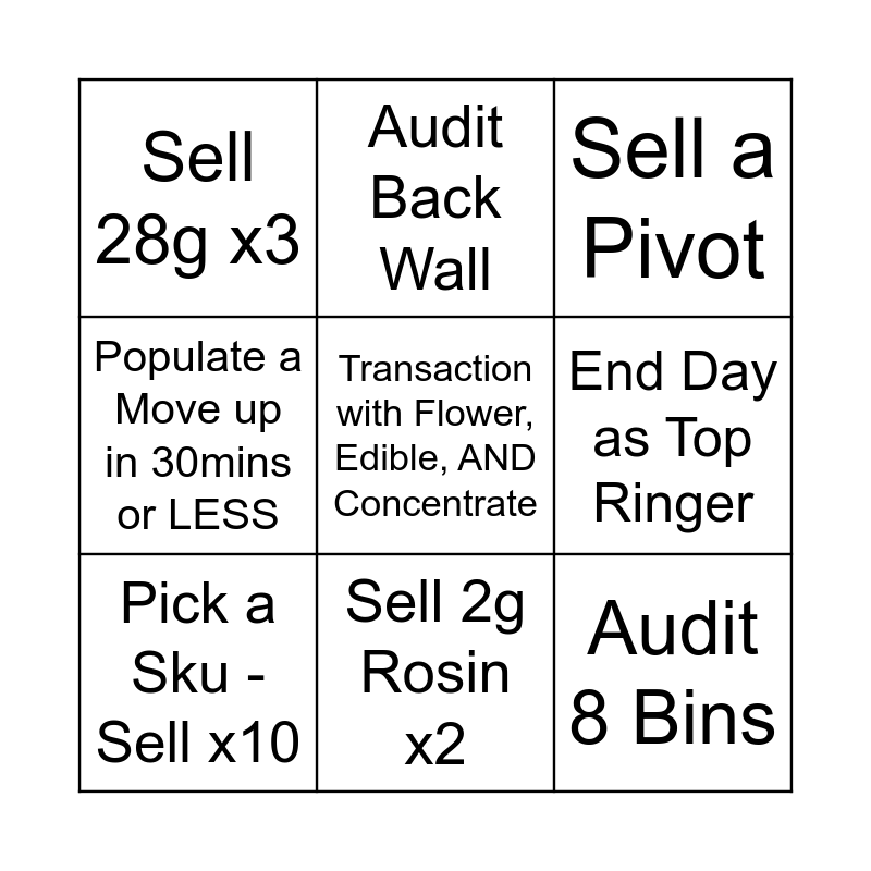 This bingo card has 9 words: Pick a Sku - Sell x10, Sell a Pivot, Audit Back Wall, Populate a Move up in 30mins or LESS, Sell 28g x3, End Day as Top Ringer, Transaction with Flower, Edible, AND Concentrate, Audit 8 Bins and Sell 2g Rosin x2.