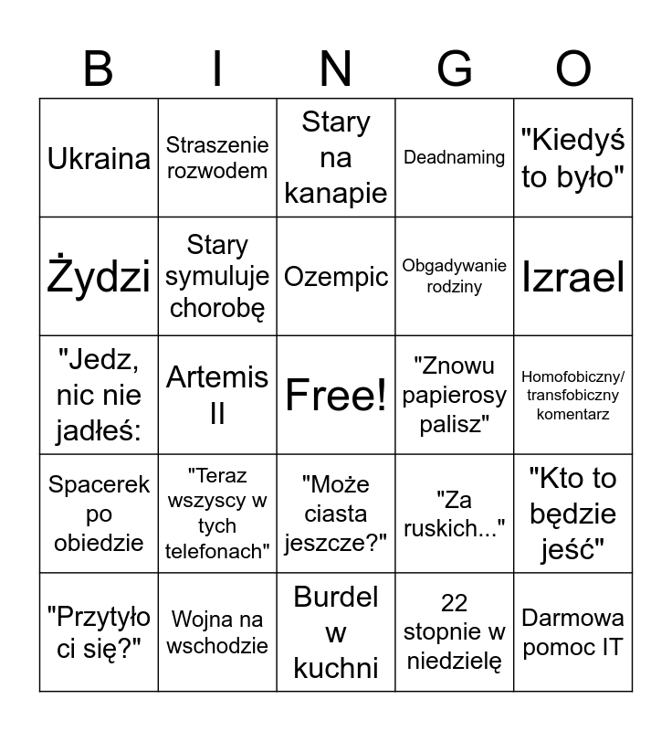 This bingo card has a free space and 24 words: "Teraz wszyscy w tych telefonach", Wojna na wschodzie, Ozempic, "Przytyło ci się?", "Kiedyś to było", Ukraina, Żydzi, Straszenie rozwodem, "Znowu papierosy palisz", "Może ciasta jeszcze?", Obgadywanie rodziny, "Jedz, nic nie jadłeś:, "Za ruskich...", "Kto to będzie jeść", Stary symuluje chorobę, 22 stopnie w niedzielę, Homofobiczny/ transfobiczny komentarz, Stary na kanapie, Izrael, Artemis II, Darmowa pomoc IT, Spacerek po obiedzie, Deadnaming and Burdel w kuchni.