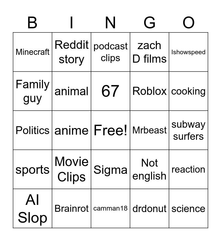 This bingo card has a free space and 24 words: Movie Clips, Brainrot, 67, AI Slop, Ishowspeed, Minecraft, Family guy, Reddit story, Mrbeast, Sigma, Roblox, Politics, Not english, reaction, animal, drdonut, subway surfers, podcast clips, cooking, anime, science, sports, zach D films and camman18.