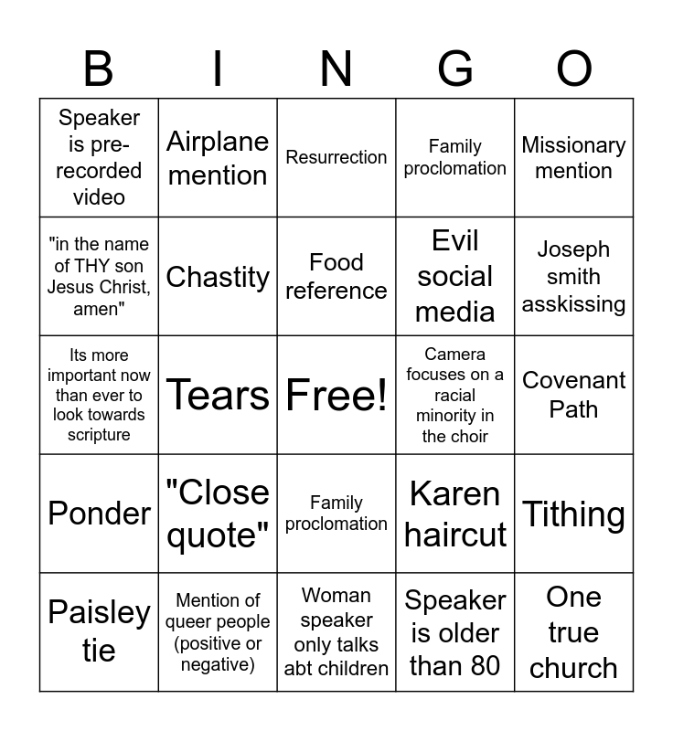 This bingo card has a free space and 24 words: "Close quote", Mention of queer people (positive or negative), Food reference, Paisley tie, Missionary mention, Speaker is pre-recorded video, "in the name of THY son Jesus Christ, amen", Airplane mention, Camera focuses on a racial minority in the choir, Family proclomation, Evil social media, Its more important now than ever to look towards scripture, Karen haircut, Tithing, Chastity, Speaker is older than 80, Covenant Path, Resurrection, Joseph smith asskissing, Tears, One true church, Ponder, Family proclomation and Woman speaker only talks abt children.