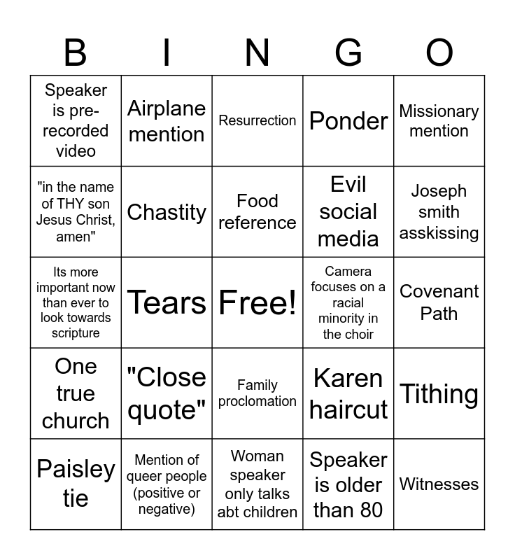 This bingo card has a free space and 24 words: "Close quote", Mention of queer people (positive or negative), Food reference, Paisley tie, Missionary mention, Speaker is pre-recorded video, "in the name of THY son Jesus Christ, amen", Airplane mention, Camera focuses on a racial minority in the choir, Family proclomation, Evil social media, Its more important now than ever to look towards scripture, Karen haircut, Tithing, Chastity, Speaker is older than 80, Covenant Path, Resurrection, Joseph smith asskissing, Tears, Witnesses, One true church, Ponder and Woman speaker only talks abt children.