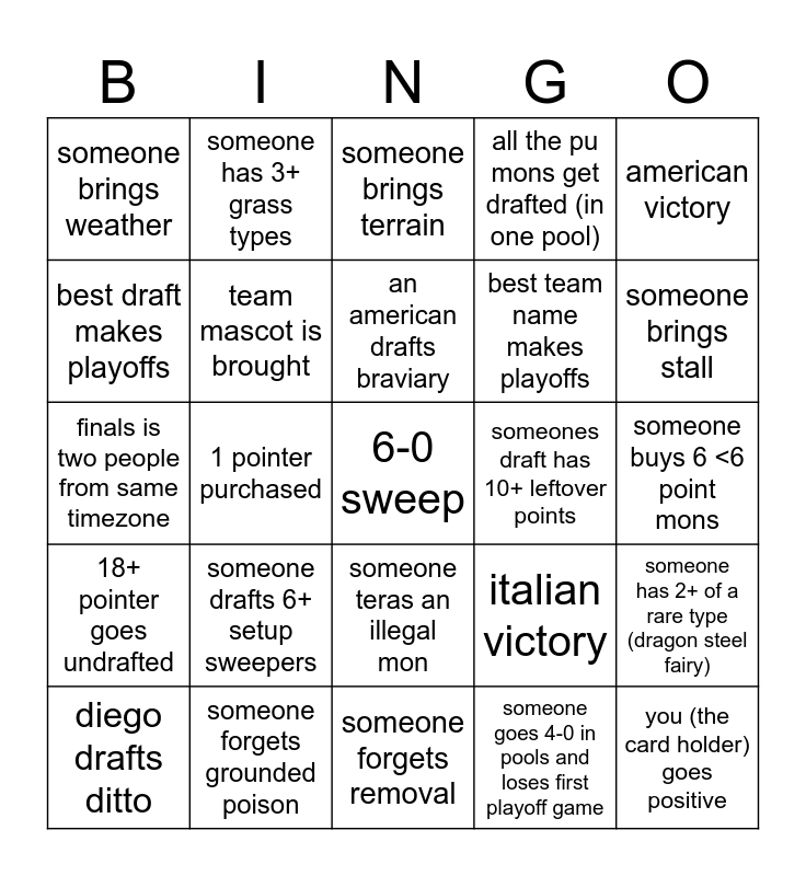 This bingo card has 30 words: someone forgets grounded poison, someone brings trick room, 1 pointer purchased, someone forgets volt immune, someone brings weather, someone brings terrain, team mascot is brought, someone teras an illegal mon, someones draft has 10+ leftover points, someone forgets removal, someone buys 6 <6 point mons, 6-0 sweep, someone goes 4-0 in pools and loses first playoff game, you (the card holder) goes positive, someone brings stall, east pooler ends in finals, italian victory, 18+ pointer goes undrafted, someone drafts 6+ setup sweepers, american victory, finals is two people from same timezone, someone forgets a resist to a type, someone has 3+ grass types, best team name makes playoffs, best draft makes playoffs, all the pu mons get drafted (in one pool), someone has 2+ of a rare type (dragon steel fairy), diego drafts ditto, an american drafts braviary and a tera locked mon goes undrafted.
