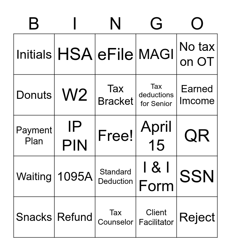 This bingo card has a free space and 29 words: Snacks, 1099-R, IP PIN, Thank you!, Initials, eFile, W2, 1095A, April 15, Refund, QR, Reject, Tax Counselor, Client Facilitator, Earned Imcome, Amount Due, Standard Deduction, Waiting, No tax on OT, Payment Plan, I & I Form, Pizza, Tax deductions for Senior, Donuts, MAGI, HSA, SSN, Tax Bracket and Form 1040.