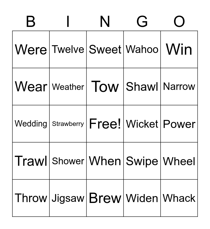 This bingo card has a free space and 164 words: Sweep, Swept, Flower, Pillow, Newt, Whale, Sweat, Wrote, Write, Snowflake, Wear, Swear, Sweet, Wipe, Swipe, Wait, Swarm, Show, Whirl, Twist, Twirl, Swirl, Whimper, Whisper, Wing, Swing, Tweak, Wake, Weak, Warm, Swig, Twin, Win, Twig, Wig, Winter, Whistle, White, Wish, Wet, Want, Went, Wind, Window, Wild, Worry, Worried, Answer, Witch, Wizard, Wiggle, Trowel, Towel, Tower, Wast, West, Waste, Power, Wonder, Wade, Widen, Wide, Narrow, Wot, Wont, Shower, Shown, Swore, Wore, Ware, Whin, Shawl, Whinny, Wolves, Swim, Wim, Wink, Squawk, Swung, Wart, Warthog, Tow, Town, Two, Wife, Wiped, Written, Weep, Wheel, Trawl, Few, Watch, Swatch, Switch, Water, Watermelon, Weather, Wean, Waggly, Waggle, Wick, Whack, Week, Wonderful, Straw, Stew, Seaweed, Throw, Wedding, Whisker, Whisk, Why, What, Where, Between, Blew, Clew, Flew, Slew, Crew, Brew, Drew, Grew, Jigsaw, Wise, Wolfhound, Weed, Were, Wendy, Whine, When, Twinkle, Twenty, Twelve, Wire, Wine, Waste, Wasteful, Wash, Wrench, View, Waddle, Wist, Well, Sandwich, Strawberry, Swoop, Whoop, Wicket, Whinge, Wear, Weigh, Wright, Weight, Knew, Wahoo, Wagon, Wallet, Wallpaper, Weasel, Walrus, Whiskey, Witter and Witty.
