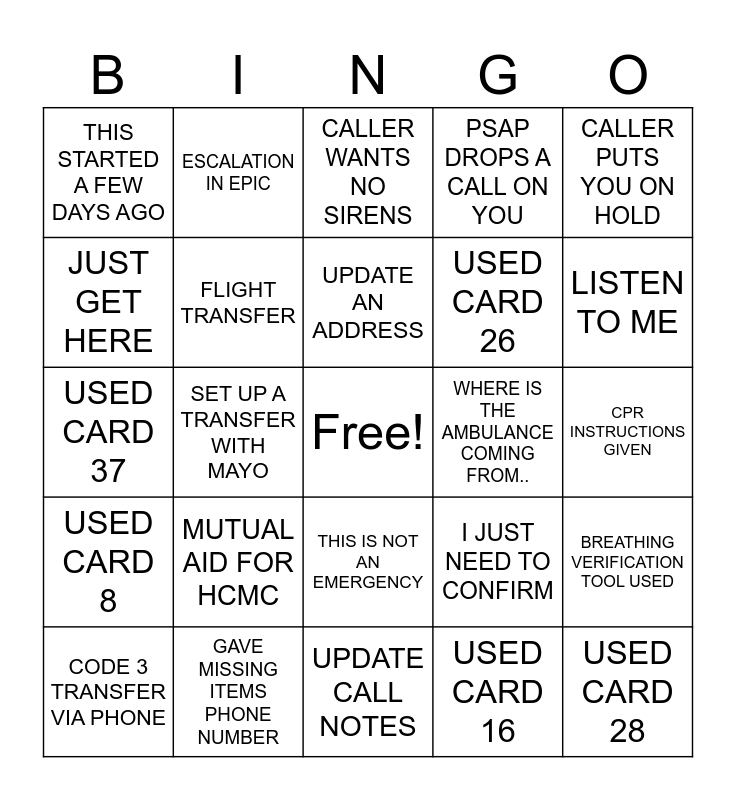 This bingo card has 40 words: HEAR SIRENS, USED CARD 37, MEDICAL DIRECTOR ON A CALL, FLIGHT TRANSFER, GAVE MISSING ITEMS PHONE NUMBER, THIS IS NOT AN EMERGENCY, UPDATE AN ADDRESS, URGENT DISCONNECT, CALLER PUTS YOU ON HOLD, USED CARD 8, SET UP A TRANSFER WITH MAYO, PSAP DROPS A CALL ON YOU, Free!, CPR INSTRUCTIONS GIVEN, WHERE IS THE AMBULANCE COMING FROM.., MUTUAL AID FOR HCMC, USED CARD 5, THIS STARTED A FEW DAYS AGO, THEY ARE COMING AS FAST AS THEY CAN, CALLER WANTS NO SIRENS, BREATHING VERIFICATION TOOL USED, USED CARD 16, USED CARD 26, JUST GET HERE, I NEED TO GET SOME CLOTHES ON, OUT OF AREA PRE-ARRIVAL, STROKE DIAGNOSTIC USED, FALLEN AND CANT GET UP, USED CARD 28, CALLER WANTS TO SPEAK WITH A SUPERVISOR, CONTROL BLEEDING INSTRUCTIONS, CODE 3 TRANSFER VIA PHONE, PUT STAND BY IN NOTES, I JUST NEED TO CONFIRM, LISTEN TO ME, UPDATE CALL NOTES, PRE-ARRIVAL LASTING MORE THAN 5 MIN, WRONG INFO IN EPIC, ESCALATION IN EPIC and USED CARD 28.