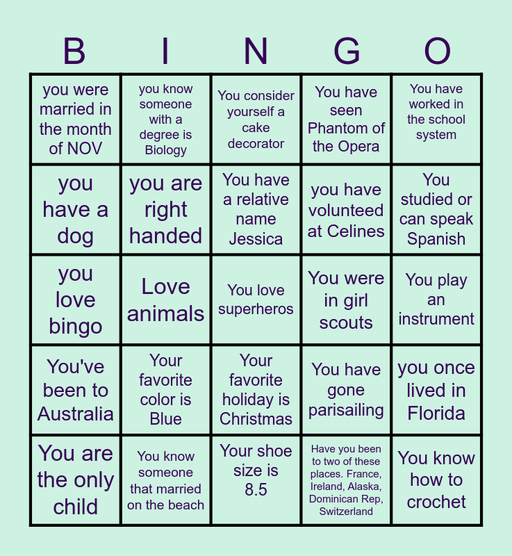 This bingo card has 25 words: Your favorite color is Blue, Your shoe size is 8.5, You have a relative name Jessica, You are the only child, You have worked in the school system, you were married in the month of NOV, you have a dog, you know someone with a degree is Biology, You were in girl scouts, Your favorite holiday is Christmas, you have volunteed at Celines, you love bingo, You have gone parisailing, you once lived in Florida, you are right handed, You know how to crochet, You play an instrument, You consider yourself a cake decorator, You studied or can speak Spanish, Love animals, You love superheros, You know someone that married on the beach, You've been to Australia, You have seen Phantom of the Opera and Have you been to two of these places. France, Ireland, Alaska, Dominican Rep, Switzerland.