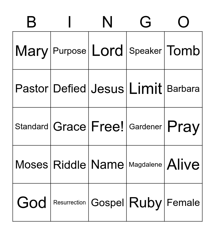 This bingo card has a free space and 24 words: Riddle, Resurrection, Jesus, God, Tomb, Mary, Pastor, Purpose, Gardener, Name, Limit, Standard, Magdalene, Alive, Defied, Ruby, Pray, Lord, Barbara, Grace, Female, Moses, Speaker and Gospel.