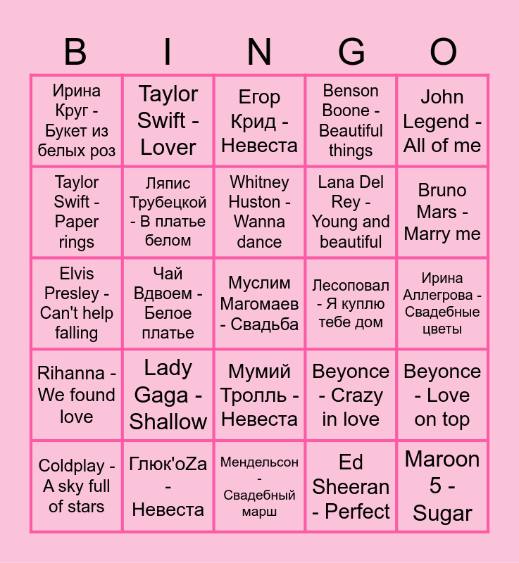 This bingo card has 30 words: Глюк'oZa - Невеста, Глюк'oZa - Жениха хотела, Чай Вдвоем - Белое платье, Авраам Руссо - Обручальная, Ирина Круг - Букет из белых роз, Егор Крид - Невеста, Ляпис Трубецкой - В платье белом, Мумий Тролль - Невеста, Лесоповал - Я куплю тебе дом, Мендельсон - Свадебный марш, Ирина Аллегрова - Свадебные цветы, Муслим Магомаев - Свадьба, Ed Sheeran - Perfect, Maroon 5 - Sugar, Bruno Mars - Marry me, Alex Warren - Ordinary, Beyonce - Crazy in love, Rihanna - We found love, Lady Gaga - Shallow, John Legend - All of me, Elvis Presley - Can't help falling, Ed Sheeran - Thinking out loud, Taylor Swift - Lover, Lana Del Rey - Young and beautiful, Taylor Swift - Paper rings, Benson Boone - Beautiful things, Beyonce - Love on top, Coldplay - A sky full of stars, Whitney Huston - Wanna dance and Justin Timberlake - Can't stop.