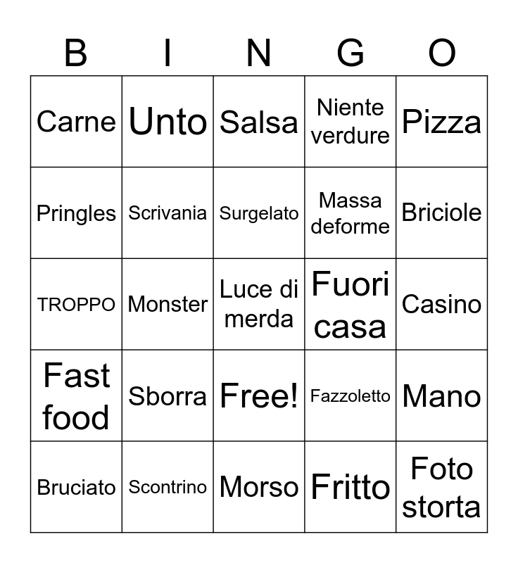 This bingo card has 26 words: Free!, Bruciato, Scrivania, Piatto ikea blu, Niente verdure, Pizza, Pringles, Unto, Surgelato, Fritto, Briciole, TROPPO, Scontrino, Morso, Fuori casa, Foto storta, Carne, Sborra, Salsa, Fazzoletto, Casino, Fast food, Monster, Luce di merda, Massa deforme and Mano.