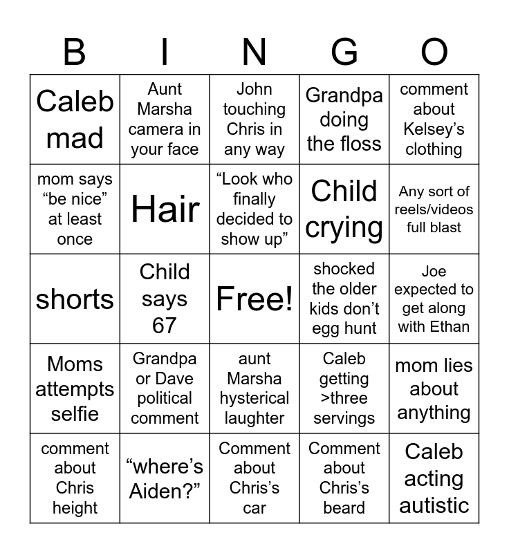 This bingo card has a free space and 24 words: Grandpa or Dave political comment, “where’s Aiden?”, “Look who finally decided to show up”, comment about Chris height, comment about Kelsey’s clothing, Caleb mad, mom says “be nice” at least once, Aunt Marsha camera in your face, shocked the older kids don’t egg hunt, aunt Marsha hysterical laughter, Child crying, shorts, Caleb getting >three servings, mom lies about anything, Hair, Comment about Chris’s beard, Joe expected to get along with Ethan, John touching Chris in any way, Any sort of reels/videos full blast, Child says 67, Caleb acting autistic, Moms attempts selfie, Grandpa doing the floss and Comment about Chris’s car.