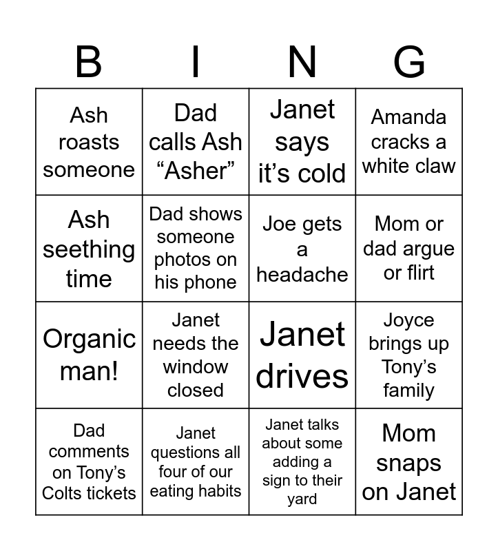 This bingo card has 16 words: Janet questions all four of our eating habits, Joyce brings up Tony’s family, Janet says it’s cold, Ash roasts someone, Organic man!, Dad calls Ash “Asher”, Janet drives, Janet talks about some adding a sign to their yard, Ash seething time, Dad shows someone photos on his phone, Dad comments on Tony’s Colts tickets, Amanda cracks a white claw, Janet needs the window closed, Mom or dad argue or flirt, Joe gets a headache and Mom snaps on Janet.
