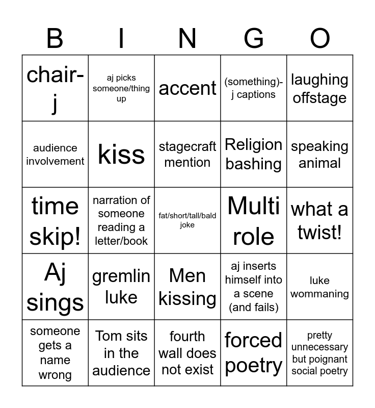 This bingo card has a free space and 24 words: gremlin luke, Tom sits in the audience, stagecraft mention, someone gets a name wrong, laughing offstage, chair-j, audience involvement, aj picks someone/thing up, Multi role, Men kissing, Religion bashing, time skip!, aj inserts himself into a scene (and fails), luke wommaning, kiss, forced poetry, what a twist!, accent, speaking animal, narration of someone reading a letter/book, pretty unnecessary but poignant social poetry, Aj sings, (something)-j captions and fourth wall does not exist.