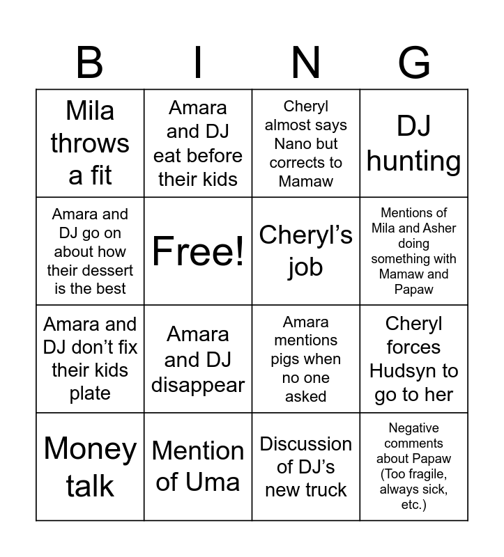 This bingo card has 16 words: Mention of Uma, Cheryl forces Hudsyn to go to her, Cheryl almost says Nano but corrects to Mamaw, Mila throws a fit, Amara and DJ don’t fix their kids plate, Amara and DJ eat before their kids, Amara mentions pigs when no one asked, Discussion of DJ’s new truck, Amara and DJ go on about how their dessert is the best, Free!, Money talk, DJ hunting, Amara and DJ disappear, Mentions of Mila and Asher doing something with Mamaw and Papaw, Cheryl’s job and Negative comments about Papaw (Too fragile, always sick, etc.).