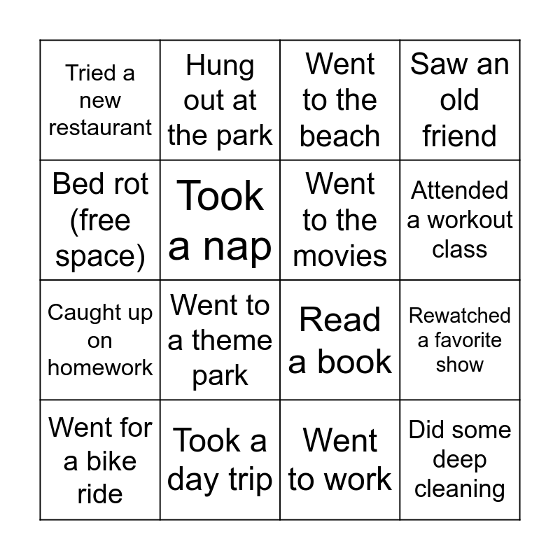 This bingo card has 16 words: Took a day trip, Rewatched a favorite show, Went to the beach, Tried a new restaurant, Caught up on homework, Hung out at the park, Read a book, Went to work, Bed rot (free space), Took a nap, Went for a bike ride, Saw an old friend, Went to a theme park, Attended a workout class, Went to the movies and Did some deep cleaning.