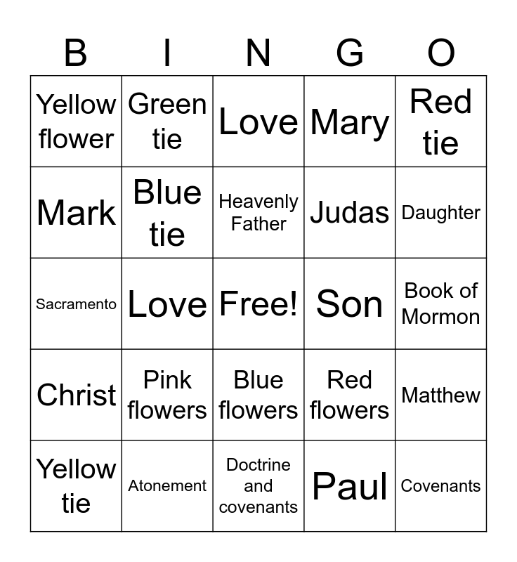 This bingo card has a free space and 33 words: Blue tie, Prophet, Love, Family, Christ, Blue tie, Red tie, Yellow tie, Green tie, Christ, Heavenly Father, Love, Children, Parents, Son, Daughter, Atonement, Sacramento, Pink flowers, Red flowers, Blue flowers, Purple flowers, Yellow flower, Book of Mormon, Doctrine and covenants, Covenants, Mary, Judas, Mark, Matthew, Peter, Paul and John.