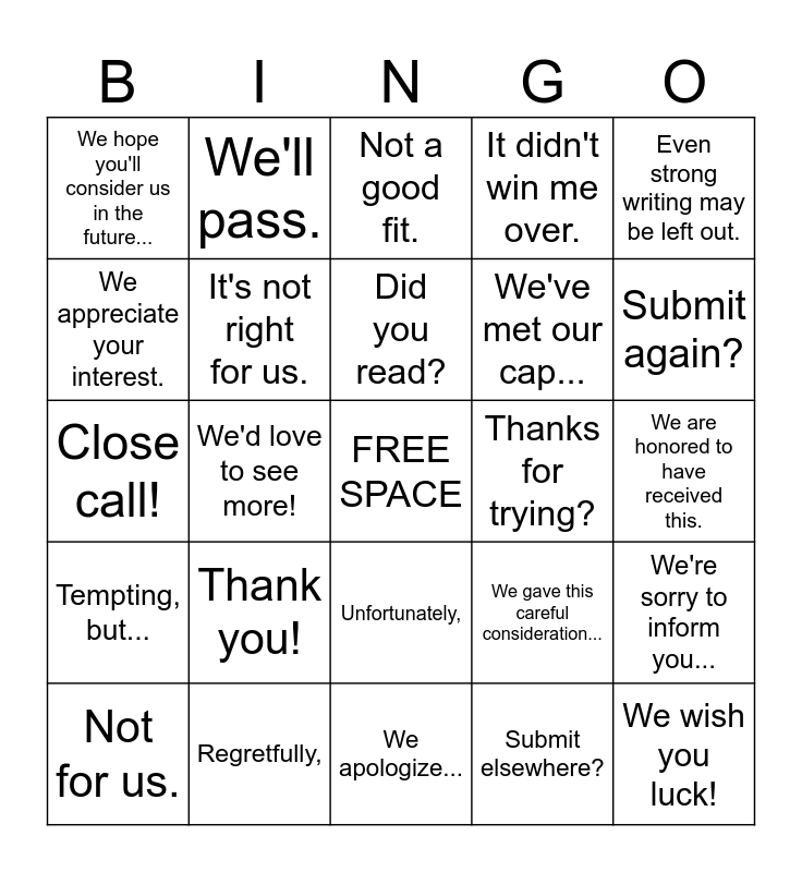This bingo card has a free space and 24 words: Thank you!, Regretfully,, Did you read?, Not for us., Even strong writing may be left out., We hope you'll consider us in the future..., We appreciate your interest., We'll pass., Thanks for trying?, Unfortunately,, We've met our cap..., Close call!, We gave this careful consideration..., We're sorry to inform you..., It's not right for us., Submit elsewhere?, We are honored to have received this., Not a good fit., Submit again?, We'd love to see more!, We wish you luck!, Tempting, but..., It didn't win me over. and We apologize....