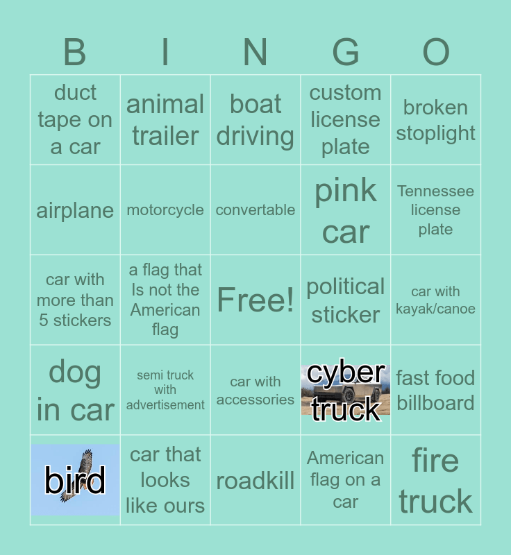This bingo card has 2 images, a free space and 27 words: cyber truck, punch buggy, pink car, roadkill, airplane, boat driving, animal trailer, dog in car, political sticker, fast food billboard, car with more than 5 stickers, custom license plate, bird, car that looks like ours, Tennessee license plate, loud car, motorcycle, convertable, semi truck with advertisement, duct tape on a car, car with kayak/canoe, American flag on a car, a flag that Is not the American flag, fire truck, car with accessories, broken stoplight and trash on the side of the road.