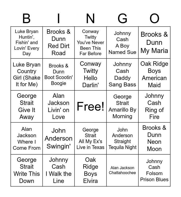 This bingo card has a free space and 32 words: Alan Jackson Chattahoochee, Alan Jackson Don't ropck the Juke Box, Alan Jackson Livin' on Love, Alan Jackson Little Bitty, Alan Jackson Where I Come From, Brooks & Dunn Boot Scootin' Boogie, Brooks & Dunn My Maria, Brooks & Dunn Neon Moon, Brooks & Dunn Red Dirt Road, Brooks & Dunn Play Something Country, Conway Twitty Hello Darlin', Conway Twitty You've Never Been This Far Before, Conway Twitty It's Only Make Believe, Conway Twitty Tight Fittin Jeans, George Strait Amarillo By Morning, George Strait Check Yes Or No, George Strait Write This Down, George Strait Give It Away, George Strait All My Ex's Live in Texas, John Anderson Swingin', John Anderson Straight Tequila Night, John Anderson Seminole Wind, Johnny Cash Ring of Fire, Johnny Cash I Walk the Line, Johnny Cash Folsom Prison Blues, Johnny Cash A Boy Named Sue, Johnny Cash Daddy Sang Bass, Luke Bryan Country Girl (Shake It for Me), Luke Bryan Huntin', Fishin' and Lovin' Every Day, Oak Ridge Boys Elvira, Oak Ridge Boys Bobbie Sue and Oak Ridge Boys American Maid.