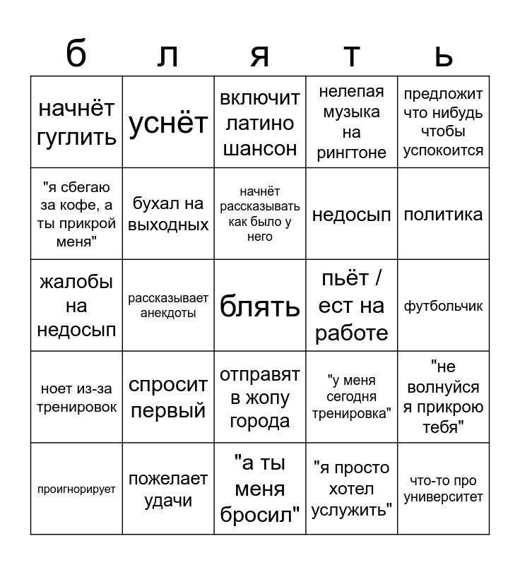 This bingo card has a free space and 24 words: спросит первый, пожелает удачи, начнёт рассказывать как было у него, проигнорирует, предложит что нибудь чтобы успокоится, начнёт гуглить, "я сбегаю за кофе, а ты прикрой меня", уснёт, пьёт /ест на работе, отправят в жопу города, недосып, жалобы на недосып, "у меня сегодня тренировка", "не волнуйся я прикрою тебя", бухал на выходных, "я просто хотел услужить", футбольчик, включит латино шансон, политика, рассказывает анекдоты, что-то про университет, ноет из-за тренировок, нелепая музыка на рингтоне and "а ты меня бросил".