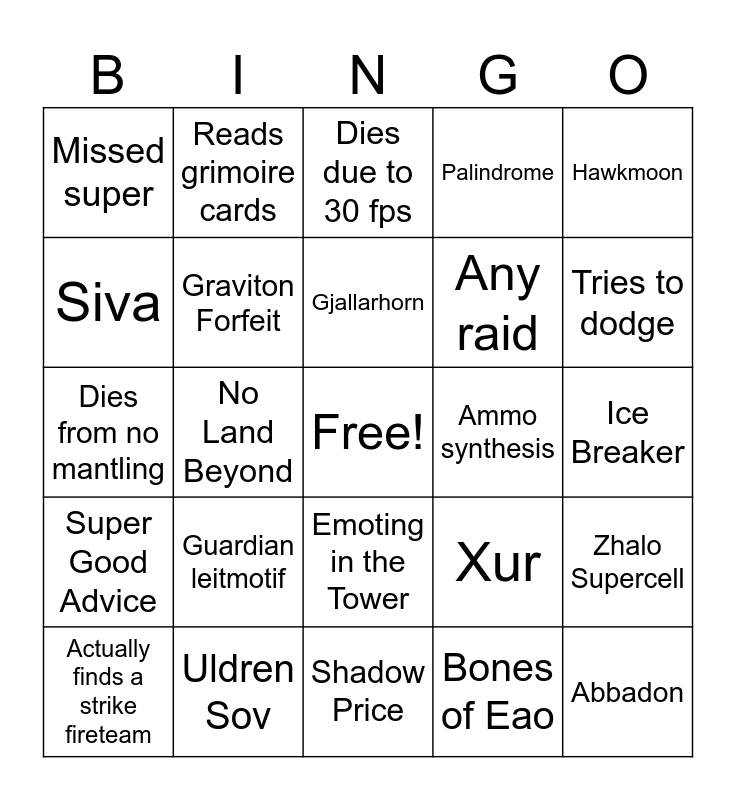 This bingo card has a free space and 24 words: Guardian leitmotif, Uldren Sov, Gjallarhorn, Actually finds a strike fireteam, Hawkmoon, Missed super, Siva, Reads grimoire cards, Ammo synthesis, Emoting in the Tower, Any raid, Dies from no mantling, Xur, Zhalo Supercell, Graviton Forfeit, Bones of Eao, Ice Breaker, Dies due to 30 fps, Tries to dodge, No Land Beyond, Abbadon, Super Good Advice, Palindrome and Shadow Price.