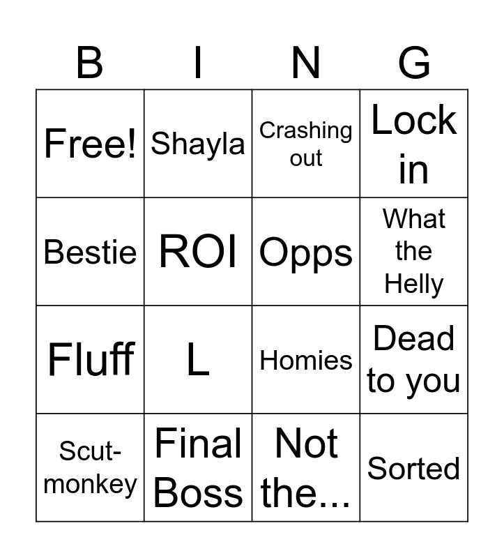 This bingo card has 16 words: Scut-monkey, Final Boss, Crashing out, Lock in, Bestie, Shayla, Homies, Dead to you, Free!, ROI, Not the..., What the Helly, Fluff, L, Opps and Sorted.